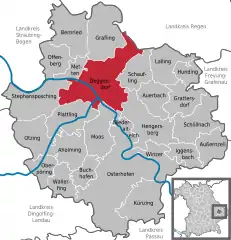 It is located on the left bank approximately in the middle between the Danube cities of Regensburg and Passau. The Danube forms the town's natural border towards the south. Towards the west, north and east the town is surrounded by the foothills of the central Bavarian Forest. Near the southwestern rim of the town, the railway bridge crosses the Danube at river-kilometer 2286. Directly south of the town Autobahn A3 and A92 form an important crossing. A few miles downstream, east of the district Deggenau, lies the confluence of the River Isar with the Danube.