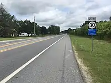 Delaware Route 30 Alternate (DE 30 Alt.) was a 0.74 mi (1.19 km)[24] alternate route of DE 30 south of the city of Milford in the Cedar Creek area. It ran from DE 30 northeast to DE 1 along two-lane undivided Johnson Road, passing through a mix of farmland, woodland, and residential development.[26][27] The route was created by 1999.[25] DE 30 Alt. originally had full access to and from DE 1, but the median crossover was modified in 2011 to only allow access from DE 30 Alt. to southbound DE 1 while retaining access to DE 30 Alt. from both directions of DE 1.[27][28] The DE 30 Alt. designation was removed from the road by 2017.[3]