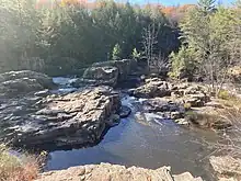 Dells of the Eau Claire County Park is in the north-central Wisconsin Town of Plover,[1] east of the city of Wausau. It is divided in two by the Eau Claire River.[1] The river flows through a rocky gorge to form cascades and waterfalls as it passes over and around weathered boulders, outcrops, and other formations. The depth of the river can vary depending on the time of the year. The park also has areas designated for camping, swimming, hiking, and picnicking.[1]
