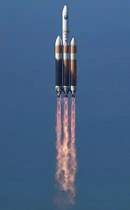 The Delta IV Heavy (Delta 9250H) is an expendable heavy-lift launch vehicle, the largest type of the Delta IV family. It is the world's third highest-capacity launch vehicle in operation, behind NASA's Space Launch System and SpaceX's Falcon Heavy and closely followed by CASC's Long March 5.[4][5] It is manufactured by United Launch Alliance (ULA) and was first launched in 2004.[6] ULA will retire the Delta IV Heavy in 2024.[7] As of June 2023, one flight remains.