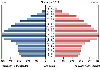 Greece's heavy demographic aging comes as a result of economic hardship which has prompted many young people to leave the country in search of better opportunities elsewhere. Between 2009 and 2018, about half a million people left the country, many of them of child-bearing age.[48] In 2010, 115,000 children were born; that number dropped to 92,000 in 2015,[49] and then to below 89,000 in 2017, the lowest on record.[48] In 2019, the fertility rate fell to just 1.3 per woman, well below the replacement level and one of the lowest in Europe. Some of the more remote regions of Greece suffer from shortages of obstetricians and gynecologists, many of whom have gone abroad, which deters would-be parents. In general, the Greeks are having children later and having fewer children in the 2010s compared to the 1980s.[48]