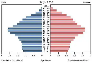 Italy's fertility rate dropped from about four in the 1960s down to 1.2 in the 2010s. This is not because young Italians do not want to procreate. Quite the contrary, having a lot of children is an Italian ideal. But its economy has been floundering since the Great Recession of 2008, with the youth unemployment rate at 35% in 2019. Many Italians have moved abroad – 150,000 did in 2018 – and many are young people pursuing educational and economic opportunities.[46] The Italian National Institute of Statistics (ISTAT) reported that the number of babies born in 2018 in Italy was the lowest since the unification of Italy in 1861.[22] Moreover, the Baby Boomers are retiring in large numbers, and their numbers eclipse those of the young people taking care of them. Only Japan has an age structure more tilted towards the elderly.[46] One possible solution to this problem is incentivizing reproduction, as France has done, by investing in longer parental leaves, daycare, and tax exemptions for parents. As of 2019, France has approximately the same population as Italy but 65% more births.[46] In 2015, Italy introduced a cash handout of €800 per couple per child. This does not seem to have had an impact in the long run. People may choose to have a child earlier, but ultimately, this does not increase the nation's fertility rate. This pattern has also been observed in other countries, family study expert Anne Gauthier of the University of Groningen told the BBC. In Italy's case, the subsidy does not address economic concerns or social attitudes.[47]
