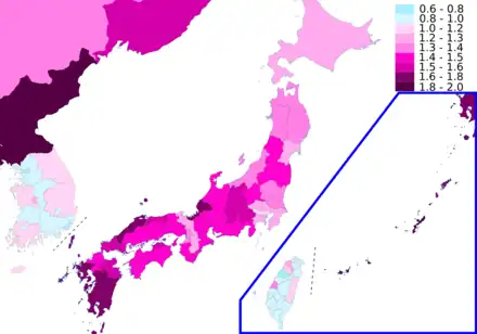 At the current rate, Taiwan is set to transition from an aged to a super-aged society, where 21% of the population is over 65 years of age, in eight years, compared to seven years for Singapore, eight years for South Korea, 11 years for Japan, 14 for the United States, 29 for France, and 51 for the United Kingdom.[31] As of 2018, Japan was already a super-aged society,[32] with 27% of its people being older than 65 years.[4] According to government data, Japan's total fertility rate was 1.43 in 2017.[34] According to the Institute for Health Metrics and Evaluation, Japan has one of the oldest populations in the world, with a median age of 47 years in 2017.[18]