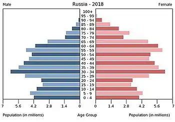 The United Nations Population Division projected that Russia, which had a birth rate of 1.75 in 2018, would find its population drop from 143 million down to 132 million by 2050.[4] Russia's population has been on the decline since the 1990s, following the collapse of the Soviet Union.[53] Another reason for Russia's demographic decline is the nation's low life expectancy for men, at only 64 years in 2015, or 15 years less than that in Italy, Germany, or Sweden. This is due to a combination of unusually high rates of alcoholism, smoking, untreated cancer, tuberculosis, suicides, violence, and HIV/AIDS.[54] Although previous attempts to raise the birth rate have failed, in 2018, President Vladimir Putin proposed giving money to low-income families, first-time mothers, families with many children, and the creation of more nurseries. This is part of a massive spending package aimed at revitalizing the struggling Russian economy.[53]
