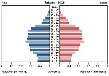 - 1 2 Liao, George (April 10, 2018). "MOI: Taiwan officially becomes an aged society with people over 65 years old breaking the 14% mark". Society. Taiwan News. Retrieved January 1, 2020.