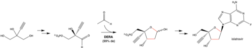 DERA is being used in chemical syntheses as a tool for green, enantioselective aldol reactions. Formation of the deoxyribose skeleton from small molecules can facilitate the synthesis of nucleoside reverse transcriptase inhibitors.[8] For example, DERA was used in a mixture of five enzymes in the biocatalytic synthesis of islatravir.[9]
