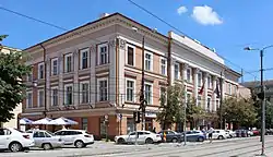 The eastern, northern and western bodies are made in the so-called "provincial baroque" style, with simple facades and windows with "traditional" frames.[4] The southern body corresponds to the neoclassical style. The ground floor of the southern body is designed as a socle with bossages. On the first and second floors, the main avant-corps is punctuated by semi-columns and pilasters with classic Corinthian capitals. The cornice decorated in a classicist manner is also noteworthy. The gate ends with a basket-handle arch. The inner courtyard has verandas leaning on arches.[4]