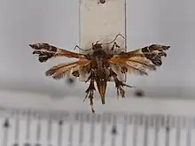 (wingspan male 13 mm) Palpi erect, smoothly-scaled, sickle-shaped, reaching vertex; third joint about one-half length of second, acuminate: whitish-ochreous, banded with ochreous-brown at joints. Head dark-brown sprinkled with dark-ochreous; a few anteriorly-erected scales on crown. Haustellum well developed. Antennae ferruginous-brown with a series of whitish dots above. Thorax golden-ferruginous, wholly suffused with dark-brown; pectus whitish. Abdomen rather stout, golden-ferruginous lightly suffused with dark-brown, across third segment a broad transverse dark-brown bar ill-defined posteriorly and tending to be continued as a short subdorsal stripe on either side; anal tuft short, concolorous with abdomen; venter whitish with a ferruginous transverse bar across fourth segment. Foreleg: femur ferruginous; tibia short, ferruginous, banded with whitish at base and provided apically with a large flattened brush-like tuft of dark-ferruginous scales; tarsi-whitish, dark-ferruginous at apex of first joint and beyond 1/2 of third joint. Midleg ferruginous: tibia with a large apical tuft of dark-ferruginous scales below which projects a pair of moderate spurs; tarsi lined with whitish above, first tarsal joint incrassated apically with short divergent posteriorly-projecting spinous hairs. Hindleg bright golden-ferruginous minutely irrorated with blackish: tibia large and stout with whorls of scales at 1/3, 2/3 and apex, the second and third whorls subequal, much larger than first, and each emitting a pair of long whitish slightly curved spurs which are banded with blackish-ferruginous at their bases and before their apices and which are roughly haired all along their posterior edges; the inner proximal spur is slightly longer than the outer, those of the distal pair are equal and are each rather shorter than the outer proximal spur; tarsal joints with very small apical whorls of spinous hairs, these whorls decreasing in size on successive tarsal joints, second joint moderately, third and fourth heavily, suffused with blackish. Forewing rather short, cleft from 3/5, second segment again cleft from about 1/2 of its length, segments sublinear without any appreciable angles: bright golden-ochreous, suffused with ferruginous especially evident between 1/5 and 2/5: extreme base of wing blackish, a whitish subcostal patch at 3/5; first segment wholly black, cut at 1/4 of its length by a narrow transverse ferruginous fascia most evident costad; second segment sharply cut at base by a line extending obliquely outwards from base of cleft to dorsum, the whole area outside of this line (and including both subsegments) wholly black. Cilia golden-ochreous on costa, ferruginous opposite ferruginous suffusion and with traces of three pale-ferruginous patches (sometimes well marked) between 4/5 and apex; at apex black; on hinder-margin of first segment blackish with a few heavy black scales towards base, at 1/2 a moderate patch of pale-ochreous and a narrow patch of pale-ochreous just before termen, where the cilia are black at their base and pale-ochreous apically; on fore-margin of second segment blackish; on termen of first subsegment pale-ochreous, blackish at their base around apex of subsegment; within second cleft blackish; at tornus pale-ochreous; blackish at their base; on dorsum ochreous-yellow with a small blackish scale-tuft at 2/3 (beneath base of first cleft), blackish beyond 4/5. Hindwing cleft from about 2/5 and 1/6, segment linear: golden-ferruginons irrorated with blackish. Cilia pale-ferruginous, darker around apices of segments and at 1/2 on hinder-margin of second segment, third segment with a large terminal patch of blackish scales occupying exterior fourth of both margins, a small black scale-tooth on dorsum at 1/2, and a few scattered blackish scales on anterior margin. TYPE โ™‚, No. 6650, in Bainbrigge Fletcher Coll.: CEYLON, Central Province, Kandy (1600 feet), May 1907 (E. Ernest Green).