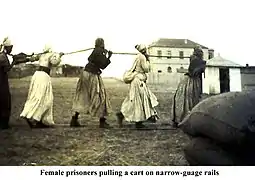 The neighbouring British objected to what they regarded as the inhumane German policy. This involved maintaining a number of concentration camps in the colony during their war against the Herero and Nama peoples. Besides these camps, the indigenous people were interned in other places. These included private businesses and government projects,[12] ships offshore,[13][14][15] Etappenkommando in charge of supplies of prisoners to companies, private persons, etc., as well as any other materials. Concentration camps implies poor sanitation and a population density that would imply disease.[16] Prisoners were used as slave labourers in mines and railways, for use by the military or settlers.[17][18][19]