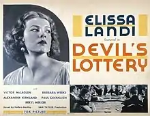 Devil's Lottery is a 1932 American pre-Code drama film directed by Sam Taylor and written by Guy Bolton. The film stars Elissa Landi, Victor McLaglen, Alexander Kirkland, Ralph Morgan, Paul Cavanagh and Barbara Weeks. The film was released on March 27, 1932, by Fox Film Corporation.[1][2][3]