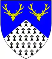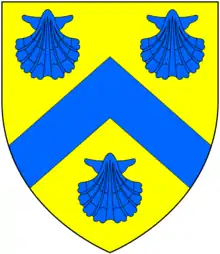 Burnard[lower-alpha 5] Argent, three escallops in bend between two bendlets azure in chief and in base a leopard's face jessant-de-lys of the last Chatsworth Lodge, Compton Gifford