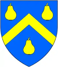 Calmady Azure, a chevron between three pears or Calmady, Penfound, Poundstock, Cornwall;Langdon, Wembury; Stoke Climsland, Cornwall; Leawood, Bridestowe;