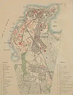 The 600 mm (1 ft 11+58 in) gauge Decauville railway was built in 1900 from Antsirane (now Antsiranana) to the Tunisian Fountain (Fontaine Tunisienne) at today's STAR factory.[1] It started at the port and ran on the Rue Gouraud and the Boulevard Bazeilles up to the Cercle Français (now Suarez Art) and up the Boulevard Militaire. It turned into the Boulevard de Sakaramy at the height of Camp Lubert, from where it led past the present town hall to l'Octroi and the Tunisian Fountain. At the end of 1900, it was extended from the Tunisian Fountain via Antanamitara and Andranomanitra to the junction of today's road to Joffreville.[2][1]