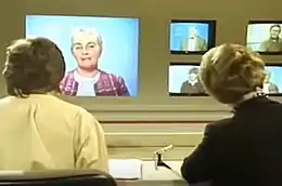Diana Gould speaking to Margaret Thatcher (right) and Sue Lawley, in the BBC's Lime Grove Studios, 24 May 1983