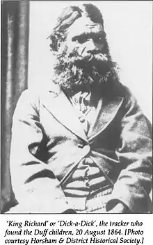 The official search was cancelled soon after the storm and newspapers reported the children as dead. On Thursday, 18 August, a neighbour of the Duff's suggested asking Dick-a-Dick and other Wotjobaluk trackers for assistance; the parents, who had not given up hope of finding their children, readily agreed.[1] Dick-a-Dick took two other Wotjobaluk men, Jerry and Fred, with him, and within hours they had rediscovered the children's trail and hours later had found the children near death.[4] Dick-a-Dick was lauded a hero and subsequently called King Richard.[5][6] He and his tracker colleagues received a reward of £15 (equivalent to $1,142 in 2022) between them, of which £5 they could spend in whatever way they wished, while the remainder was given to their white employer to ensure it was not wasted.[4]