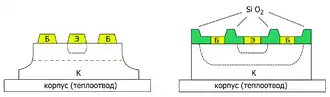Comparison of the mesa (left) and planar (Hoerni, right) technologies. Dimensions are shown schematically.
