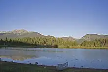 The original town of Dillon was built as a stage stop and trading post on the northeast side of the Snake River.[6] The town was named for Tom Dillon, a prospector,[7] and was incorporated in 1883.[8] By 1892 the town had been relocated twice, both times in order to be closer to railroad lines that were extended into the area.[6] All three of these historic townsites were situated very close to the Blue River Valley confluence where the Snake River and Tenmile Creek flowed in, and this area is now referred to collectively as "Old Dillon".