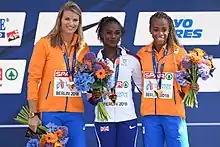 Dina Asher-Smith (C) with her gold on the women's 200 m podium at the 2018 European Championships.