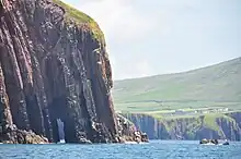 There are no notable islands within the bay, but towards the head, several peninsulas, in particular Inch Strand, extend a significant distance across its width. Part of the bay is a protected lowland estuary with tidal flats.[2] On the south side of the bay, on the Iveragh Peninsula, there is a bird sanctuary which is an important breeding site for the red-billed chough. This area has cliffs, topped with grassland and heathland.[1]