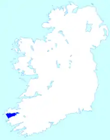 The bay runs approximately 40 km (25 mi) from northeast to southwest into the Atlantic Ocean. It is approximately 3 km (1.9 mi) wide at the head, and 20 km (12 mi) wide at the entrance. It is flanked on the north by the Dingle Peninsula, and on the south by the Iveragh Peninsula. The River Maine enters the bay at its head. The harbour town of Dingle lies on the north side of the bay. Other settlements overlooking the bay include Ventry, Ballymeentrant, Beenbane, and Kinard, and Annascaul and Glenbeigh lie near the bay. Killorglin lies at the head of the bay at the mouth of the River Laune.[1]