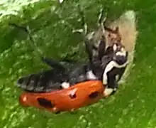 The Dinocampus coccinellae wasp parasitises the lady beetle species Coleomegilla maculata. The wasp lays a single egg in the beetle's haemocoel where the larva develops, to emerge approximately 20 days later. The wasp larva then pupates with its cocoon underneath the living body of the beetle host. At this point the lady beetle host, which has previously behaved normally, stops moving, is afflicted with twitches or tremors, and becomes a semi-paralysed guardian of the wasp cocoon[1][2] – often referred to as a "zombie bodyguard"[3][4][5] – until the adult wasp emerges a week later. Around a quarter to a third of lady beetles subsequently recover.[2][4]