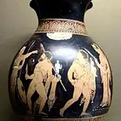 When the sacrifice of Iphigenia (Agamemnon's daughter) became a necessity for the Achaeans to sail away from Aulis, King Agamemnon had to choose between sacrificing his daughter and resigning from his post of high commander among Achaeans. When he decided to sacrifice his daughter to Artemis, Odysseus carried out this order of Agamemnon by luring Iphigenia from Mycenae to Aulis, where murder, disguised as wedding, awaited her.[9] According to Hyginus, Diomedes went with Odysseus to fetch Iphigenia, making this the two companions' first mission together.[10] However, Pseudo-Apollodorus has Agamemnon send Odysseus and Talthybius instead.[11] According to Euripides, neither of the two went to fetch Iphigenia, though he calls the plan Odysseus' idea in Iphigenia at Taurus.[12]