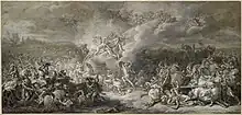 Virgil's Aeneid describes the beauty and prosperity of Diomedes' kingdom. When war broke out between Aeneas and Turnus, Turnus tried to persuade Diomedes to aid them in the war against the Trojans. Diomedes told them he had fought enough Trojans in his lifetime and urged Turnus that it was best to make peace with Aeneas than to fight the Trojans. He also said that his purpose in Italy is to live in peace.[40] Venulus, one of Latinus' messengers, recalls the mission to Diomedes after they seek his help in the war against the Rutulians. He states that when he found Diomedes, he was laying the foundations of his new city, Argyrippa.[41] Diomedes eventually speaks and states that, as punishment for his involvement at Troy, he never reached his fatherland of Argos and that he never saw his beloved wife again. The hero also states that birds pursue him and his soldiers, birds which used to be his companions and cry out everywhere they land, including the sea cliffs.[41] Ovid, on the other hand, writes that Venulus came to the home of exiled Diomedes in vain, but he was erecting walls with the favour of Iapygian Daunus, his new father-in-law, which would make the city Luceria, not Argyrippa.[42]
