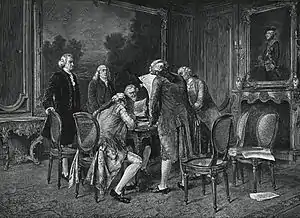 - ↑ Treaty of Paris in oils, by Benjamin West (1783). The British delegation refused to pose, and the painting was never completed.
