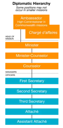 In modern diplomatic practice, there are a number of diplomatic ranks below Ambassador. Since most missions are now headed by an ambassador, these ranks now rarely indicate a mission's (or its host nation's) relative importance, but rather reflect the diplomat's individual seniority within their own nation's diplomatic career path and in the diplomatic corps in the host nation: