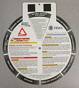 • The Emergency Preparedness and Response wiki, prepared by the American Institute for Conservation[29] and including the Emergency Response and Salvage Wheel. The Wheel was previously available as an iPhone app but as of 2021 requires updating from 32-bit format.[30]