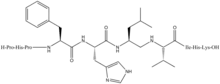 Pepstatin was the first synthetic renin inhibitor. It is of microbial origin and is an N-acyl-pentapeptide, more accurately: isovaleryl-L-valyl-L-valyl-statyl-L-alanyl-statine.[8][29] Pepstatin was found to be a potent competitive inhibitor of most aspartic proteases, but a weak inhibitor of renin.[30] Originally, it was thought to be effective in the treatment of duodenal ulcers, and went through clinical trials, but had no success.[31][32] Statine, an amino acid, is thought to be responsible for the inhibitory activity of pepstatin, because it mimics the tetrahedral transition state of the peptide catalysis.[33] Because of hydrophobic properties of statine, pepstatin has very low solubility in physiological media.[34] Since it had low potency and poor solubility, it did not enter in vivo studies.