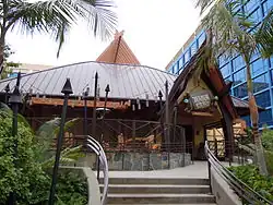 Guests traveled between the hotel and the Disneyland Park main entrance via a tram.[10] The Disneyland Monorail was extended from its original 1959 configuration and a station opened at the hotel in 1961 (pictured above). Recreational areas, attractions, and a convention center (1972) were also added over the years. On June 15, 1970 an adjacent recreation vehicle park called Vacationland opened (which had its own pool and clubhouse) which can be seen as a precursor to Disney's Fort Wilderness Resort & Campground which opened at Walt Disney World in 1971.[11] The hotel also featured a Richfield service station for several years as part of Richfield's sponsorship of several Disneyland attractions, including Autopia.