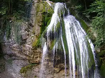 Djur-djur (Armenian: Ջուր-Ջուր — water-water; Crimean Tatar: Curcur — «onomatopoeia to the falling water»)[2] — waterfall is located on the Ulu-Uzen' river in the Crimean Mountains of Crimea. Waterfall height is 16 metres (52 ft). Djur-djur has not dried up ever, even in the dry years. Water from the waterfall falls into a small lake, and then comes into the river channel, which flows into the sea near the village Solnechnogorsk.[3]