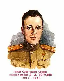 Dmitry Dmitrievich Pogodin (Russian: Дмитрий Дмитриевич Погодин; 11 September 1907 - 13 September 1943) was a Russian tank company commander in the Spanish Civil War who was awarded the title Hero of the Soviet Union. After serving in the Spanish Republican Army he rose through the ranks of the Red Army, seeing combat during the Soviet invasion of Poland and Winter War before his death in World War II when he was a major-general.[1] He was a member of Central Committee of the Communist Party of Byelorussia.