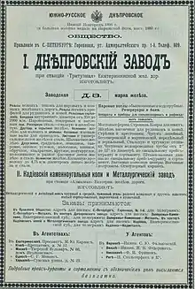 The 1907 advertisement of companies of the South-Russian Dnieper Association that mentions the Dnieper Works
