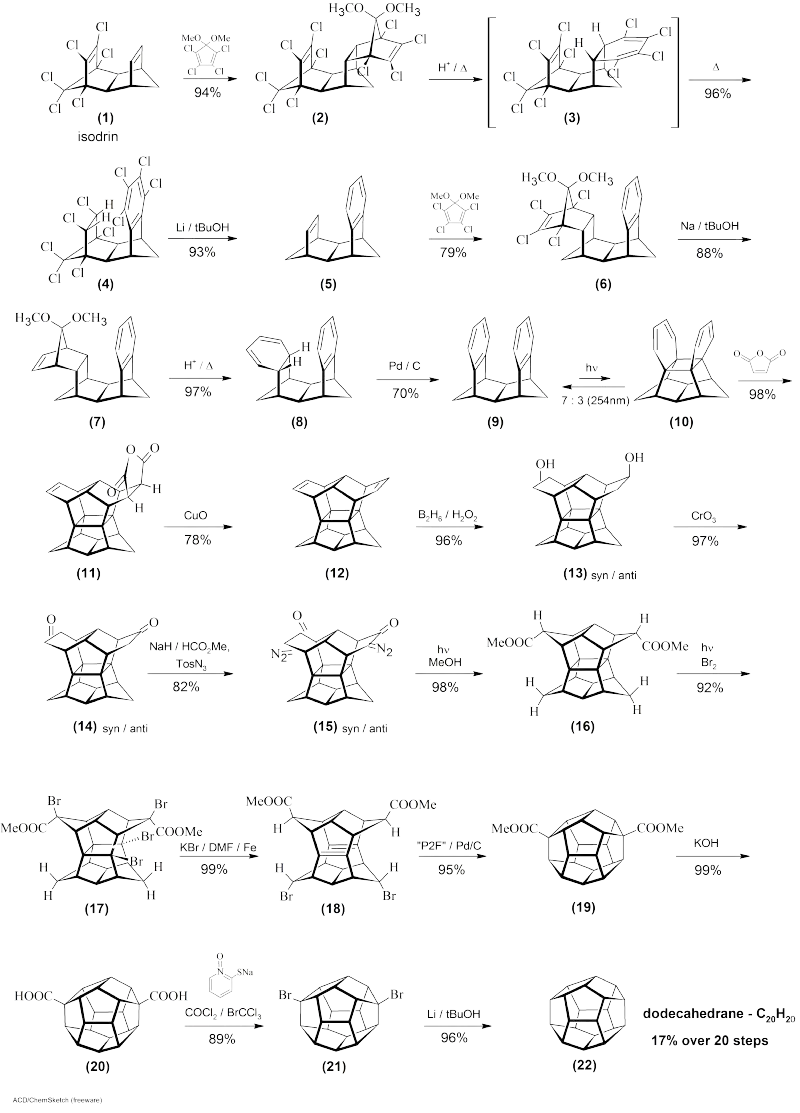 Leo Paquette's group at Ohio State University was the first to succeed, by a complex 29-step route that mostly builds the dodecahedral skeleton one ring at a time, and finally closes the last hole.[2]