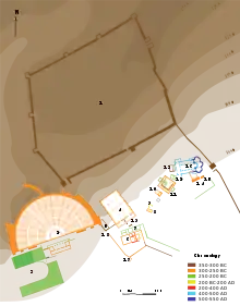 Although the earliest inscriptions at the site date to c. 550–500 BCE,[6] archaeological excavations conducted for more than a century have recovered artifacts as early as the Mycenaean era,[7] many now at the National Archaeological Museum of Athens, and some in the archaeological museum at nearby Ioannina. There was an ancient tradition that Dodona was founded as a colony from the city, also named Dodona, in Thessaly.[8]