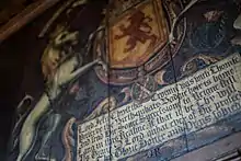 James IV hung his bedchamber with scarlet velvet, some of this fabric was stolen in 1506.[102] The tapestry used in Scottish royal palaces is well-documented. At Stirling Castle, in 1585, the king's "own hall" contained five pieces of tapestry with a dais (cloth of estate) of red damask fringed with gold, a cupboard, and a hanging chandelier of timber. Two suites of tapestry with five pieces were hanging in the palace at Stirling in 1578, the Triumph of Verity and the History of Roboam. Four pieces of the Hunts of the Unicorn were displayed in another room in 1578, and this suite was recreated by Historic Environment Scotland and weavers in association with West Dean College.[103]
