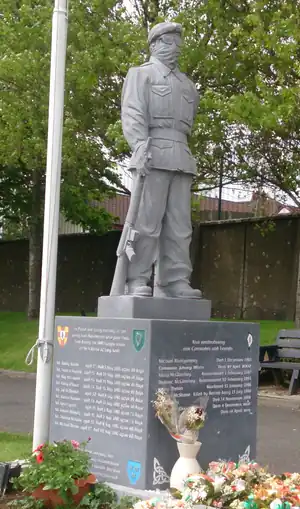 McGlinchey only ever crossed the border into Northern Ireland when an operation required it, which made it harder for the security services to maintain effective surveillance.[64][note 33] In spite of secret surveillance south of the border,[36][122] the Special Reconnaissance Unit[note 34] had difficulty monitoring McGlinchey, argues the journalist Peter Taylor. As a result, they "did the next best thing and latched on to an INLA associate", Seamus Grew.[123] Grew was a close friend of Mary McGlinchey.[69] By tailing Grew north of the border, the SRU hoped to be led to McGlinchey.[124] The RUC's intelligence arm, E4A, believing him to be in Armagh, thought they knew the route he would be taking back to the south.[86] Six days after the Droppin Well bombing, Grew and another INLA member Roderick "Roddy" Carroll, were shot dead at an RUC checkpoint while driving through Mullacreevie.[86] McGlinchey—the intended target[99]—had been seen getting into their car in the south by The Det surveillance. He was believed to be bringing a bag of guns[36][125] into the north.[73] This was not the case;[126][note 35] the handbrake was on,[122] and neither were Grew or Carroll armed.[125] It seems probable that he had been in the vehicle a few minutes earlier, but had alighted before reaching the roadblock,[130] with what the Belfast priest and peace activist Fra Raymond Murray has called an "instinctive intuition".[131] Dillon posits that the army had a shoot-to-kill policy with regard to McGlinchey, believing him to be always heavily armed and unlikely to surrender without a fight.[79]