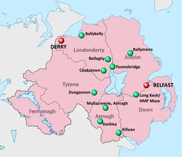 According to McGlinchey, the trio expanded their theatre of operations—"we didn't confine ourselves to South Derry", he said—after the IRA's failed 1974 ceasefire. Their activities included bombing barracks (for example, Magherafelt and Toomebridge), towns (including Kilrea, Maghera and Ballymena), as well as killing RUC and UDR men.[34] He particularly favoured those of the latter who lived in isolated, exposed houses, as this made them particularly vulnerable. The towns and police stations he targeted were always in strongly nationalist towns, as he felt that not only would the operation be popular but they would have good escape routes.[35] McGlinchey later calculated that this amounted to over 200 operations[34] over "an intricate maze of fields, lanes, country roads and ditches with which they were intimately familiar".[35] They knew where to hide, how to escape, and who was sympathetic to them; the latter provided them not only with food and drink but intelligence on police and army movements.[35] On one occasion in 1977, McGlinchey evaded the RUC in Randalstown, Antrim—three members of which he had just shot at—with the help of a friendly fisherman who hijacked a motorboat and ferried him across Lough Neagh to Tyrone and his escape.[44] The author Ed Moloney interviewed an anonymous IRA man from the time who described McGlinchey's gang, as well as relations between them and the IRA leadership of Martin McGuinness and Gerry Adams.[45]
