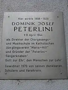 Peterlini died in Vienna at the age of 69 and was buried on 14 April 1944 at the Friedhof Mauer. In 1954, in his honour in the Liesing Mauer district, the Peterlinigasse was named after him; before that, the street was called Draschegasse, which is why it had to be renamed in the course of the redefinition and renumbering of the Liesing municipal district to avoid street name redundancies, as a Draschestraße already existed in the Inzersdorf district. At Westbahnstraße 40 in the district of Neubau, a memorial plaque commemorates Peterlini's work as "director of the choir singing and music school in the Catholic Boys' Association "Maria-Hilf" and founder of the "Peterlini Boys' Choir".[2] There is also a commemorative plaque at Lange Gasse 96 in Mauer, where Peterlini last lived.[3] His estate is in the music collection of the Austrian National Library.