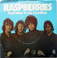 Capitol Records chose to release "Don't Want to Say Goodbye" as the lead single from Raspberries.[9] The song stalled at #86 on the Billboard Hot 100, but did better in some areas.[6] For example, it was a hit in the band's native Cleveland and reached the Top 20 on the survey of the radio station KYSN in Colorado Springs.[6][10][11][12][13] It also reached #90 on the Cash Box Top 100 and #89 on the Record World Singles Chart.[14][15] Music journalist Ken Sharp said that one of the reasons the single did not perform well was that it was too long, at 5 minutes, when it is difficult to get radio programmers to play new artists even when the single is shorter.[16]
