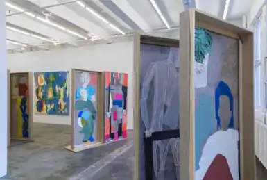 In 2016, Nelson returned to the figure in her two-sided, variously constructed "Box" works[49]—free-standing, door-sized painted panels that verge on architecture and continue to employ unconventional materials and processes.[4][22] Critics describe installations of the work, such as her 2017 show "Models Stand Close to the Paintings,"[50] as a "loose, kaleidoscopic maze of contrasting viewpoints" and interacting works—a sense furthered by the central, abstracted figures Nelson portrays in them.[4][22][51] Critics such as Dan Cameron noted Nelson's disruption of the frontality of conventional painting, as well as the evolution of the physical presence of her two-sided works into a new, metaphorical level.[52][53]