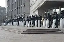 The Donetsk Republic organisation continued to occupy the RSA and upheld all previous calls for a referendum and the release of their leader Pavel Gubarev.[53][lower-alpha 2] On 8 April, about a thousand people rallied in front of the RSA listening to speeches about the Donetsk People's Republic and to Soviet and Russian music.[54] Ukrainian media stated that a number of Russian citizens, including one leader of a far-right militant group, had also taken part in the events.[55]