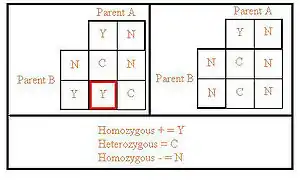 These diagrams, known as Punnett squares, are used to illustrate the method of trait transfer to offspring according to classical Mendelian genetics. In the Punnett square to the left, two heterozygous individuals (carriers) can potentially form three types of offspring: homozygous positive, heterozygous carriers and homozygous negative, in the ratio of 1:2:1. Homozygous positive offspring (highlighted in red) will completely express the particular recessive trait, in this case the genetic disorder. In the Punnett square to the right, a heterozygous carrier individual and a homozygous negative individual can potentially form two types of offspring: heterozygous carriers and homozygous negative, in the ratio of 1:1, and are necessarily unable to produce any affected offspring, barring a new random mutation. It is the situation depicted on the left, in which couples have the potential of producing affected offspring, that Dor Yeshorim attempts to prevent.