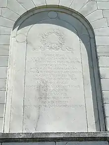 The dedication ceremony for the monument occurred on March 17, 1902, on the 126th anniversary of the evacuation of Boston.[10] The celebrations began around noon with a procession of members of the United States Marine Corps, with Governor Winthrop M. Crane and other guests of honor riding in a carriage.[11] After the Governor and guests had assembled at the monument, the Marine band played "The Star-Spangled Banner". Afterwards, Governor Crane gave an address to the crowd and a tablet in the front of the monument, which previously had been covered with American flags, was unveiled, after which the band played "America".[12]