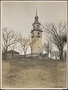 In June 1898, the Massachusetts General Court passed a resolution appropriating $25,000 for the creation of a monument at Dorchester Heights to commemorate the construction of the redoubts that led to the British evacuation.[2][5] Following this, the Governor of Massachusetts assembled a committee with his Executive Council and in May 1899 opened a limited competition for designs for the monument.[6] Eight architectural firms submitted proposals, and in October 1899 the submission by Peabody & Stearns was selected.[3][7] The following month, construction bidding commenced.[8] In both 1901 and 1902, the General Court voted to increase funding for the construction, the first time for $8,000 and the second time for $3,000. Additionally, a total of $10,000 was appropriated for dedication purposes.[9] In total, construction on the monument lasted from 1899 to 1902.[3]