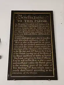A number of books owned by Calthorpe were bequeathed in her will to both specific relatives and the future inhabitants of the alms-houses.[10]