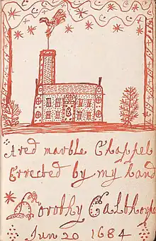 The title page also contains a drawing of a chapel in red ink and the following inscription: A red marble Chappel Errected by my hand Dorothy Calthorpe Jun 20 1684. Making her book not only a personal space in which to record her own narratives and poems but also a chapel in which she displayed her spiritual devotion through writing.[3]