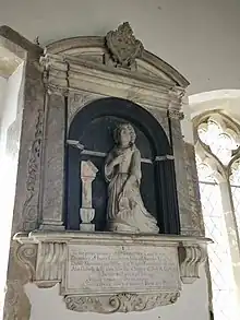 A marble monument is mounted on the south wall of St Peter's Church Ampton depicting her knelling by a bookstand with allegorical carvings including a skull and an hourglass.